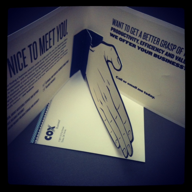 #1. Send an introduction. Did you know that you can actually mail a handshake? Well, you can. A printed piece was created with a matching envelope – the card represented the Cox Business Sales person actually introducing themselves to the potential customer-to-be. The 3D mailer was an actual hand that came right out of the card when it was opened. (Remember…unique, complicated, amazing!) Talk about attention getting.